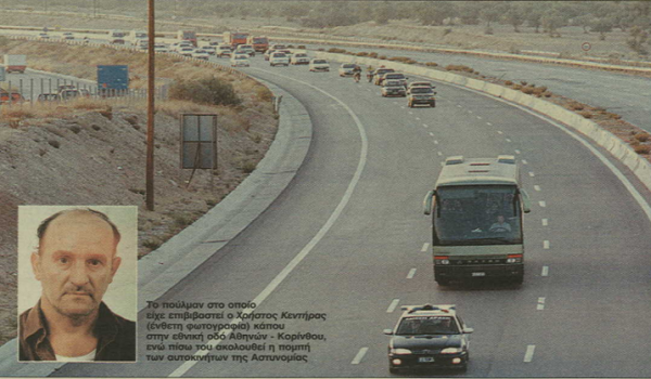 Το λεωφορείο κατευθύνθηκε αρχικώς προς την Αθήνα αλλά το μπλόκο της Αστυνομίας στο ύψος των διοδίων της Ελευσίνας τον ανάγκασε να επιστρέψει προς την Κόρινθο και γύρω στις 2.00 το μεσημέρι κατευθυνόταν ήδη πάλι προς την περιοχή της Τροιζηνίας! Μετά την αναχώρησή του από τα διόδια της Ελευσίνας ο δράστης, που δήλωσε ότι κουβαλάει και ένα πιστόλι των 9 mm, φέρεται να πυροβόλησε, χωρίς να τραυματίσει, τον αστυνομικό της Άμεσης Δράσης Δημήτρη Γιοβανίδη, ο οποίος επιχείρησε να προσεγγίσει με την υπηρεσιακή μοτοσικλέτα του το λεωφορείο, από δική του πρωτοβουλία και χωρίς να έχει λάβει σχετική εντολή. Παρόλο που η ενέργειά του αυτή προκάλεσε και πανικόβαλε τον Κεντήρα, κάνοντάς τον να πυροβολήσει θέτοντας σε κίνδυνο τη ζωή των ομήρων, ο αστυνομικός ουδέποτε τιμωρήθηκε, ούτε κλήθηκε να ερμηνεύσει την πράξη του.
