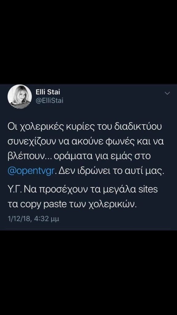 Συγκεκριμένα έγραψε: «Οι χολερικές κυρίες του διαδικτύου συνεχίζουν να ακούνε φωνές και να βλέπουν… οράματα για εμάς στο Open Tv. Δεν ιδρώνει το αυτί μας. Να προσέχουν τα μεγάλα sites τα copy paste των χολερικών.»
