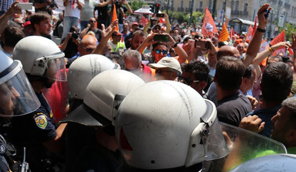 Οι διαμαρτυρόμενοι βλέποντας τα ρολά να κατεβαίνουν κινήθηκαν ξανά προς την είσοδο απαιτώντας να περάσει η αντιπροσωπεία τους.