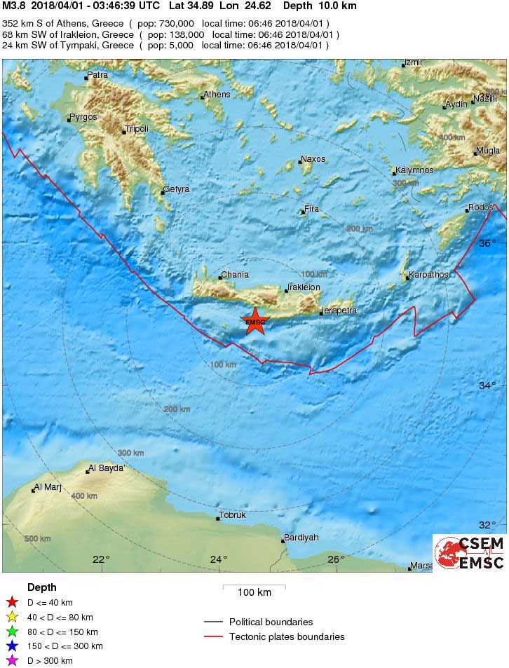 Με τρεις σεισμικές δονήσεις “επισκέφθηκε” ο Εγκέλαδος την Κρήτη τα ξημερώματα και πιο συγκεκριμένα από τις 5:00 το πρωί έως τις 6:45.