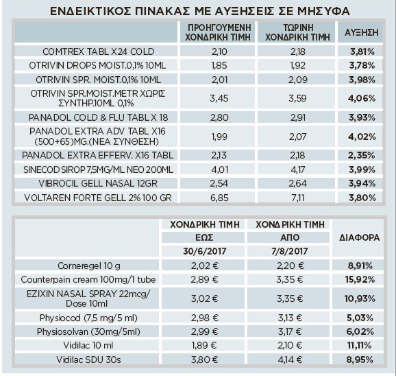 Αντίστοιχα, το γνωστό Panadol cold and flu (tabl x 18), από 2,80 ευρώ χονδρική τιμή, τώρα πωλείται στα 2,91 ευρώ (3,93% αύξηση διαφοράς). Ενα ακραίο παράδειγμα αύξησης κατά σχεδόν 16% στη χονδρική τιμή αποτελεί η γνωστή κρέμα Counterpain που από 2,89 ευρώ πήγε στα 3,35 ευρώ.