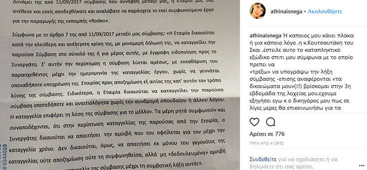 Η Αθηναΐς Νέγκα δημοσίευσε το εξώδικο στον προσωπικό της λογαριασμό στο Instagram, όπου σχολιάζει: «Ή κάποιος μου κάνει πλάκα ή για κάποιο λόγο, η κ. Κουτσαυτάκη του ΣΚΑΪ, έστειλε αυτό το καταπληκτικό εξώδικο σπίτι μου σύμφωνα με το οποίο πρέπει να “τρέξω” να υπογράψω την λήξη σύμβασης -επίσης αναφέρονται “τα δικαιώματα μου”(;!!) βρίσκομαι στην 3η εβδομάδα της λοχείας μου, έχουμε εξηγήσει εγώ κ ο δικηγόρος μου πως σε λίγες μέρες θα επικοινωνήσω για τα περαιτέρω.