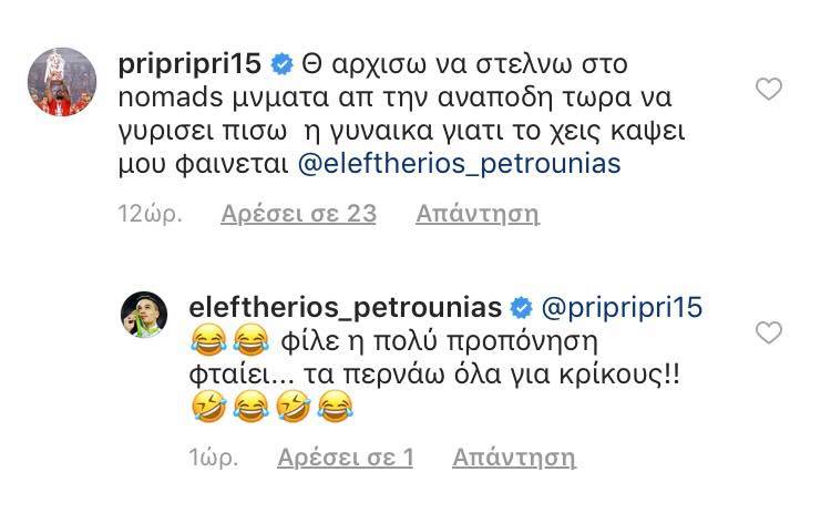 Ο Λευτέρης Πετρούνιας μάλλον είναι ένας από τους φανατικούς τηλεθεατές του NOMADS, καθώς η αγαπημένη του, Βασιλική Μιλλούση, «μάχεται» στο Palawan, ενώ αρκετές φορές έχει αναφερθεί σε εκείνον, χωρίς να κρύβει τα συναισθήματά της.