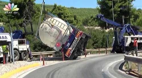 Ανατροπή βυτιοφόρου με χημικά στην εθνική οδό