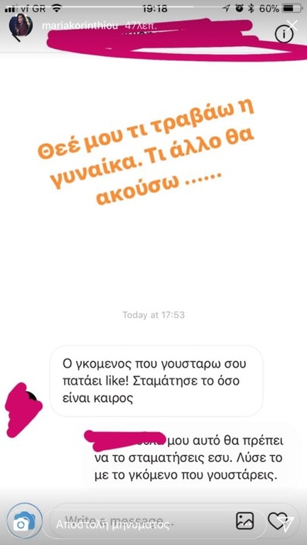 Όπως έδειξε στο story της και φροντίζοντας να μην εκθέσει την κοπέλα που της έστειλε μήνυμα, μας έδειξε το διάλογο που είχε. Συγκεκριμένα έλαβε το εξής μήνυμα: «Ο γκόμενος που γουστάρω σου πατάει like! Σταμάτησέ το όσο είναι καιρός».