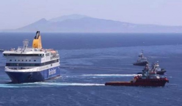 Αγκυροβολημένο στο ακρωτήρι Βρόντου της Ίου βρίσκεται το επιβατηγό οχηματαγωγό πλοίο «BLUE STAR PATMOS» ΝΠ 12119, που αποκολλήθηκε χθες το απόγευμα από ξέρα στην οποία είχε προσαράξει την Τετάρτη 30 Αυγούστου, κατά την είσοδό του στο λιμάνι του νησιού.