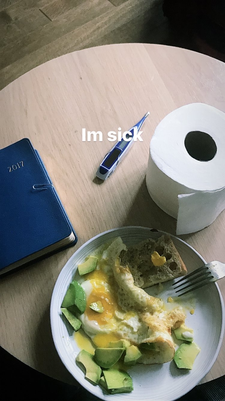 Στο προσκήνιο βρίσκεται ένα θερμόμετρο, ενώ η ίδια σημείωσε: «I’m sick». Φρόντισε δε να μας δείξει και το γεύμα που επέλεξε για το πρωινό της, ώστε να δυναμώσει και να ανταποκριθεί καλύτερα.