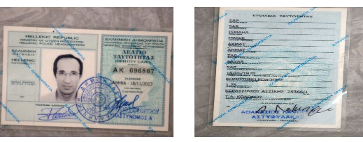 -πλαστό δελτίο αστυνομικής ταυτότητας με αριθμό «ΑΚ 696867», ημερομηνία έκδοσης 18-11-2013 και στοιχεία κατόχου «ΣΑΡ ΙΣΜΑΗΛ», όνομα πατρός «ΑΧΜΑΤ», όνομα μητρός «ΛΑΥΛΑ», ημερομηνία γέννησης 18-5-1970, τόπο γέννησης «Κομοτηνή» και εκδούσα Αρχή «Τ.Α. Κολωνού»,