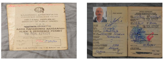 άδεια παραμονής αλλοδαπού με στοιχεία κατόχου «ZAT ISMAIL» του «ΜOUSTAFA», γεννηθείς 01-07-1953 στην Τουρκία, στο εμπροσθόφυλλο της οποίας υπήρχε, μεταξύ άλλων, η χειρόγραφη ένδειξη «ΤΠΑ 34020»,