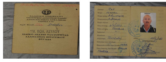ειδικό δελτίο ταυτότητας αλλοδαπού πολιτικού φυγάδα, με αναγραφόμενα στοιχεία «ZAT ISMAΙL» του «ΜOUSTAFA», γεννηθείς 01-07-1953 στην Τουρκία, στο εμπροσθόφυλλο του οποίου υπήρχε, μεταξύ άλλων, η χειρόγραφη ένδειξη «ΤΠΑ 34020».