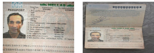 πλαστό διαβατήριο Ελληνικών Αρχών με αριθμό «ΑΙ 3389933», όνομα κατόχου «ΣΑΡ ΙΣΜΑΗΛ», γεννηθείς 18-05-1970 στην Κομοτηνή,