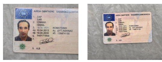 πλαστή άδεια οδήγησης Ελληνικών Αρχών με αριθμό «540171846», όνομα κατόχου «ΣΑΡ ΙΣΜΑΗΛ» και ημερομηνία γέννησης 18-05-1970 στην Κομοτηνή,