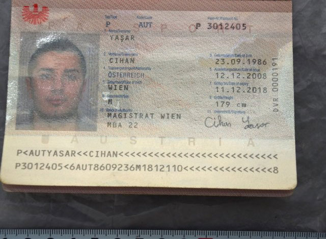 πλαστό διαβατήριο Αρχών Δημοκρατίας της Αυστρίας με αριθμό «Ρ3012405», όνομα κατόχου «ΥΑSAR CIHAN» και ημερομηνία γέννησης 23-09-1986 στην Αυστρία,