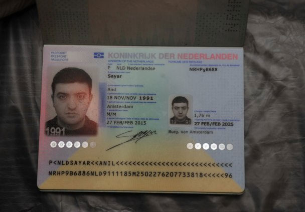 διαβατήριο Ολλανδικών Αρχών με αριθμό «ΝRHP9B688», όνομα κατόχου « Sayar Anil» και ημερομηνία γέννησης 18-11-1991 στο Άμστερνταμ,