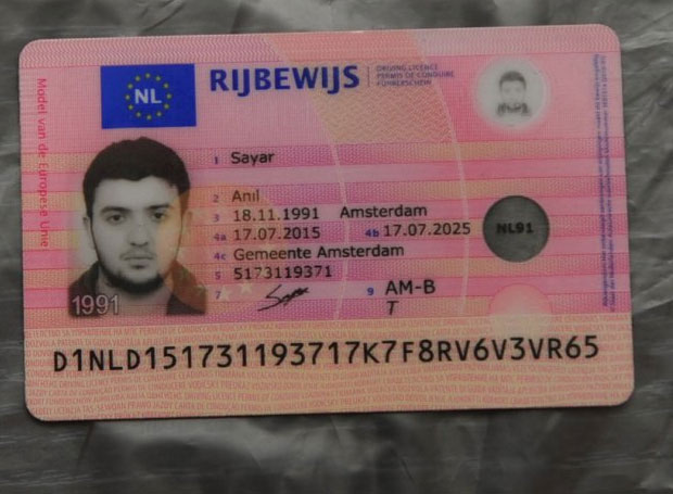 άδεια οδήγησης εκδοθείσα από Αρχές της Ολλανδίας, με στοιχεία κατόχου «Sayar Anil» και ημερομηνία γέννησης 18-11-1991 στο Άμστερνταμ,