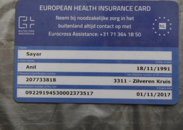 ευρωπαϊκή κάρτα υγείας με αριθμό «09229194530002373517», εκδοθείσα από Αρχές της Ολλανδίας, με όνομα κατόχου « Sayar Anil » και ημερομηνία γέννησης 18-11-1991,