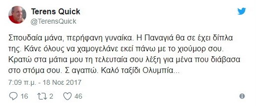 «Σπουδαία μάνα, περήφανη γυναίκα. Η Παναγιά θα σε έχει δίπλα της. Κάνε όλους να χαμογελάνε εκεί πάνω με το χιούμορ σου. Κρατώ στα μάτια μου τη τελευταία σου λέξη για μένα που διάβασα στο στόμα σου. Σ αγαπώ. Καλό ταξίδι Ολυμπία…», έγραψε.