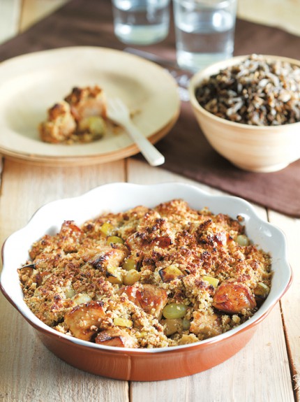 Ένα εντυπωσιακό πιάτο όπου το τρυφερό κρέας της γαλοπούλας συναντιέται με τη γλύκα των φρούτων αγκαλιασμένο από μια ωραία κρούστα από βρώμη, παρμεζάνα και κάρι.