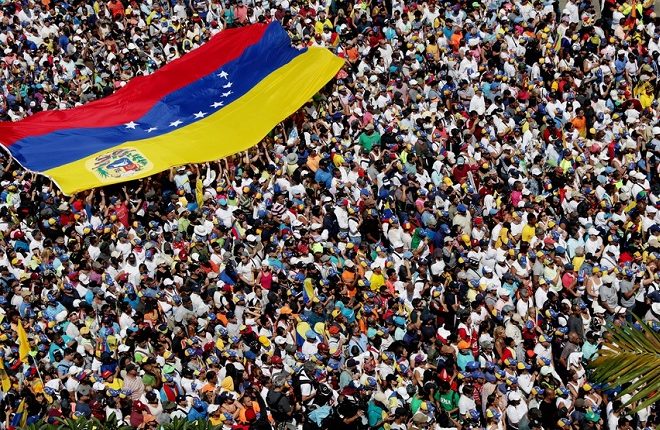 Περισσότεροι από 100.000 διαδηλωτές πλημμύρισαν τους δρόμους του Καράκας σήμερα αξιώνοντας την απομάκρυνση του προέδρου Νικολάς Μαδούρο από την εξουσία, με τον ηγέτη της αντιπολίτευσης και αυτοανακηρυχθέντα μεταβατικό πρόεδρο Χουάν Γκουαΐδό να δηλώνει ότι «η αλλαγή στη Βενεζουέλα είναι πολύ, πολύ κοντά».