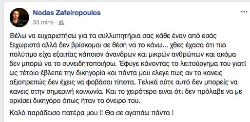 «Θέλω να ευχαριστήσω για τα συλλυπητήριά σας κάθε έναν από σας ξεχωριστά αλλά δε βρίσκομαι σε θέση να το κάνω… χθες έχασα ό,τι πιο πολύτιμο είχα εξαιτίας κάποιων άνανδρων και μικρών ανθρώπων και ακόμα δεν μπορώ να το συνειδητοποιήσω. Έφυγε κάνοντας το λειτούργημά του γιατί ως τέτοιο έβλεπε την δικηγορία και πάντα μου έλεγε πως αν το κάνεις αξιοπρεπώς δεν έχει να φοβάσαι τίποτα. Τελικά ούτε αυτό δεν μπορείς να κάνεις στη σημερινή κοινωνία. Και το χειρότερο είναι ότι δεν πρόλαβε να με ορκίσει δικηγόρο όπως ήταν το όνειρό του. Καλό παράδεισο πατέρα μου!! Θα σε αγαπάω πάντα!»
