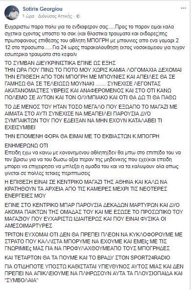 Ο λόγος για τον Σωτήρη Γεωργίου, ραδιοφωνικό παραγωγό του Sport 24 Radio 103.3 και αρθρογράφο του contra.gr, ο οποίος, με ανάρτησή του στο Facebook, έκανε γνωστό το επεισόδιο που συνέβη σε μπαρ του Κολωνακίου, τα ξημερώματα της Δευτέρας.