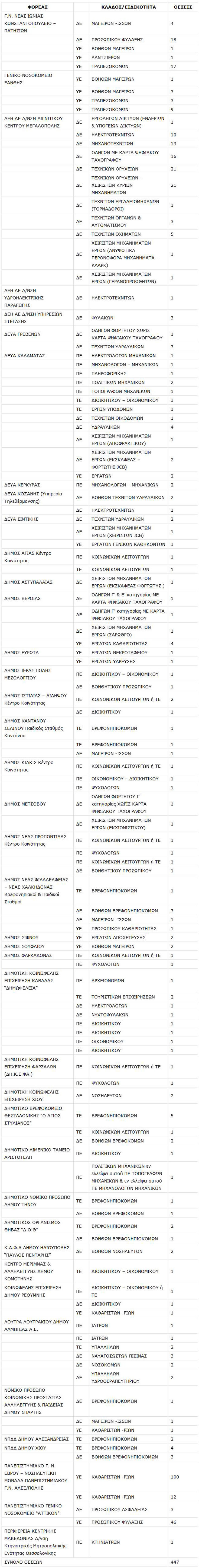 Τη μερίδα του λέοντος λαμβάνουν οι φορείς: Διεύθυνση Λιγνιτικού Κέντρου Μεγαλόπολης της ΔΕΗ (93 θέσεις), ΔΕΥΑ Καλαμάτας (20 θέσεις), Γ.Ν Νέας Ιωνίας Κωνσταντοπούλειο-Πατησίων, Δημοτική Κοινωφελής Επιχείρηση Καβάλας “Δημωφέλει” (εννέα θέσεις) και Πανεπιστημιακό Γ.Ν Έβρου-Νοσηλευτική Μονάδα Πανεπιστημιακού Γ.Ν Αλεξανδρούπολης (100 θέσεις). Η πλειονότητα των νέων συνεργατών θα υπογράψει οκτάμηνες συμβάσεις ιδιωτικού δικαίου ορισμένου χρόνου.