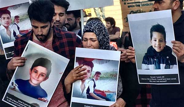Οι συγκεντρωμένοι καταγγέλλουν ολιγωρία των ελληνικών αρχών στο ναυάγιο της 16ης Μαρτίου στο Αγαθονήσι, με αποτέλεσμα να χάσουν τη ζωή τους 16 πρόσφυγες.