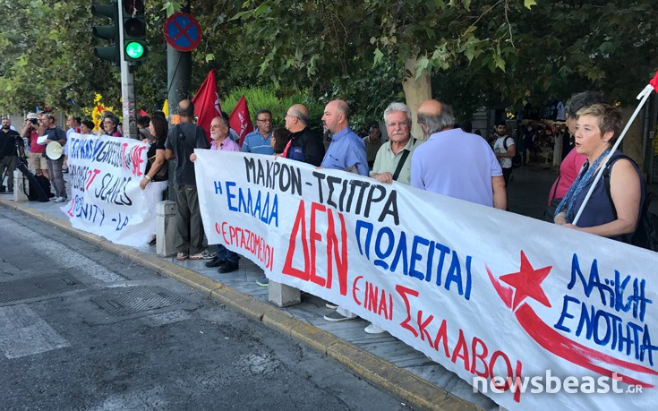 Οι διαδηλωτές κρατούσαν στα χέρια τους δύο πανό, με το ίδιο μήνυμα, το ένα γραμμένο στα ελληνικά και το άλλο στα αγγλικά. Αυτό ανέφερε: «Τσίπρα-Μακρόν, η Ελλάδα δεν πωλείται, οι εργαζόμενοι δεν είναι σκλάβοι».