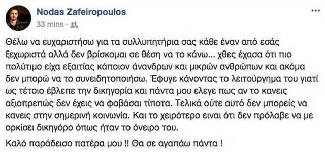Ενδεικτική είναι η ανάρτηση του γιου του, Νώντα, στο facebook, όπου σημειώνει πως αν και θέλει να ευχαριστήσει για τα συλλυπητήρια που δέχεται, δεν είναι σε θέση να το κάνει. «Χθες έχασα ότι πιο πολύτιμο είχα, εξαιτίας κάποιων άνανδρων και μικρών ανθρώπων και ακόμα δεν μπορώ να το συνειδητοποιήσω», αναφέρει ο Νώστας Ζαφειρόπουλος, ο οποίος ακολουθεί τα βήματα του πατέρα του στη δικηγορία και δεν κρύβει την πίκρα του για το γεγονός ότι «δεν πρόλαβε να με ορκίσει δικηγόρο, όπως ήταν το όνειρο του».