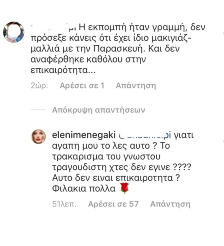 «Η εκπομπή ήταν γραμμένη, δεν πρόσεξε κανείς ότι έχει ίδιο μακιγιάζ-μαλλιά με την Παρασκευή. Και δεν αναφέρθηκε καθόλου στην επικαιρότητα…», έγραψε χαρακτηριστικά, με την Ελένη να παίρνει δημόσια θέση και να την διαψεύδει, απαντώντας «γιατί αγάπη μου το λες αυτό; Το τρακάρισμα του γνωστού τραγουδιστή χθες δεν έγινε; Αυτό δεν είναι επικαιρότητα; Φιλάκια πολλά!».