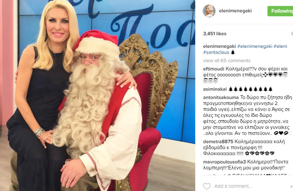 Η Ελένη Μενεγάκη άρχισε την εβδομάδα της με μία ιδιαίτερη αγκαλιά.Πριν ακόμα ξεκινήσει η εκπομπή της, η παρουσιάστρια βρέθηκε στο πλατό της, όπως κάνει άλλωστε καθημερινά, ώστε να ελέγξει και την τελευταία λεπτομέρεια. Εκεί ήταν και ο Άγιος Βασίλης, όπου μετά την έναρξη της εκπομπής θα έχουν την ευκαιρία να τον απολαύσουν και οι τηλεθεατές.