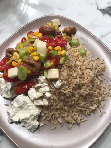 Τρελαίνομαι για το καστανό ρύζι και το έχω εντάξει στο διαιτολόγιο μου σίγουρα 2-3 φορές την εβδομάδα. Για το βραδινό μου το συνοδεύω με σαλάτα εποχής ή ότι έχω στο ψυγείο μου. Σήμερα έβαλα ντομάτα, αγγουράκια, καλαμπόκι και πιπεριές.