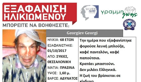 Συγκεκριμένα, ο 68χρονος έχει έρθει από τη Βουλγαρία στις 24/09/2017 και φιλοξενούνταν προσωρινά στις Συκιές Θεσσαλονίκης, σε σπίτι φίλου του. Την 01/10/2017, εξαφανίσθηκε από το σπίτι στο οποίο φιλοξενούνταν και έκτοτε δεν είχε δώσει σημεία ζωής.
