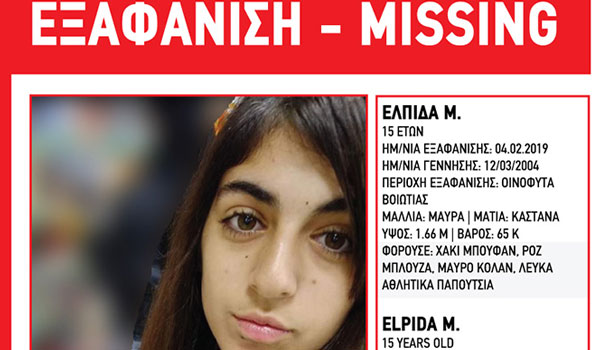 Συναγερμός σήμανε στο «Χαμόγελο του Παιδιού» μετά την εξαφάνιση της 15χρονης Ελπίδας Μ. από τα Οινόφυτα Βοιωτίας, τη Δευτέρα 04/02/2019, στις 16:00 ώρα.