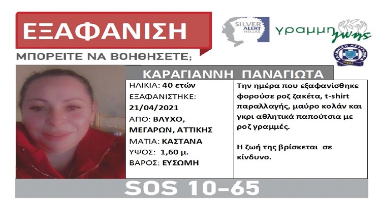 Η Καραγιάννη Παναγιώτα, 40 ετών, την 21/04/21 εξαφανίστηκε από το σπίτι της, στο Βλυχό, Μεγάρων, Αττικής. Έχει καστανά μάτια, ύψος 1,60μ και είναι εύσωμη.
