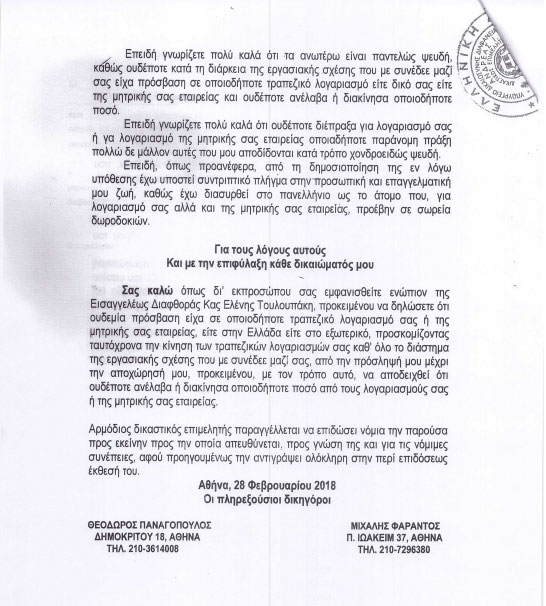 Για τους λόγους αυτούς Και με την επιφύλαξη κάθε δικαιώματος μου Σας καλώ όπως δια εκπροσώπου σας εμφανισθείτε ενώπιον της Εισαγγελέως Διαφθοράς Κας Ελένης Τουλουπάκη, προκειμένου να δηλώσετε ότι ουδεμία πρόσβαση είχα σε οποιοδήποτε τραπεζικό λογαριασμό σας ή της μητρικής σας εταιρείας, είτε στην Ελλάδα είτε στο εξωτερικό, προσκομίζοντας ταυτόχρονα την κίνηση των τραπεζικών λογαριασμών σας καθ’ όλο το διάστημα της εργασιακής σχέσης που με συνέδεε μαζί σας, από την πρόσληψή μου μέχρι την αποχώρησή μου, προκειμένου, με τον τρόπο αυτό, να αποδειχθεί ότι ουδέποτε ανέλαβα ή διακίνησα οποιοδήποτε ποσό από τους λογαριασμούς σας ή της μητρικής σας εταιρείας».