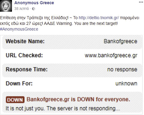 Οι ίδιοι τις προηγούμενες ημέρες είχαν προειδοποιήσει μέσω του Facebook για το χτύπημα στην Τράπεζα της Ελλάδος.