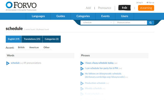 Το Forvo υπερηφανεύεται ότι είναι το μεγαλύτερο λεξικό προφοράς στον κόσμο. Μπορεί και να είναι αλήθεια, επειδή ο οδηγός προφοράς αναπτύσσεται από τους χρήστες του. Κάντε εγγραφή και μπορείτε να προσθέσετε την δικής σας προφορά σε λέξεις.