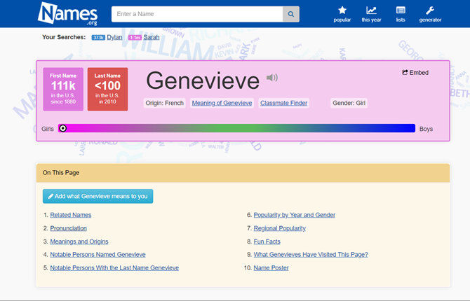 Κάθε όνομα οδηγεί σε καταπληκτικές πληροφορίες και στατιστικά στοιχεία σχετικά με αυτό. Μπορείτε να μάθετε πόσο δημοφιλές είναι το όνομά σας ή τι σημαίνει.