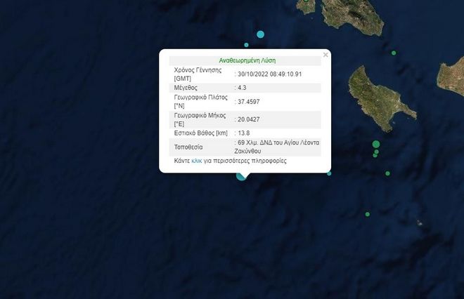 Το επίκεντρο του σεισμού εντοπίζεται στα 58 χιλιόμετρα δυτικά-νοτιοδυτικά του Αγίου Λέοντα στη Ζάκυνθο.