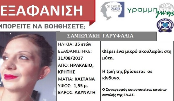 Η Γαρυαφαλλιά Σαμιωτάκη, εντοπίστηκε σήμερα και επέστρεψε στην οικογένειά της υγιής, όπως επιβεβαιώθηκε και από την Διεύθυνση Αστυνομίας Ηρακλείου.