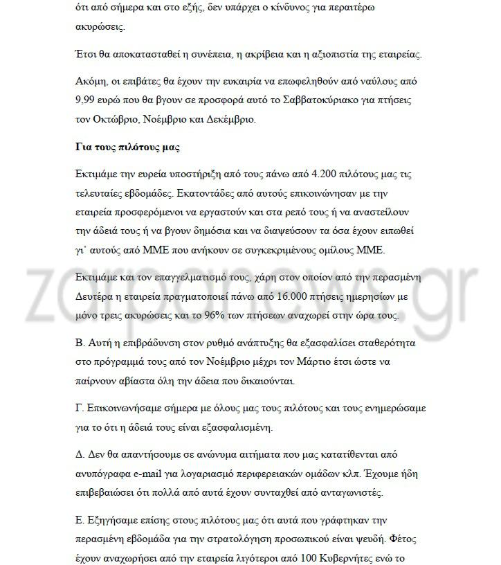 Στην απάντησή της που παρουσιάζει το zarpanews.gr η ιρλανδική εταιρεία χαμηλού κόστους εξηγεί ότι με αυτόν τον τρόπο θα βάλει «τέλος» στις ακυρώσεις πτήσεων ενώ θα συμμορφωθεί με τις σχετικές οδηγίες για τις άδειες των πιλότων.