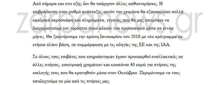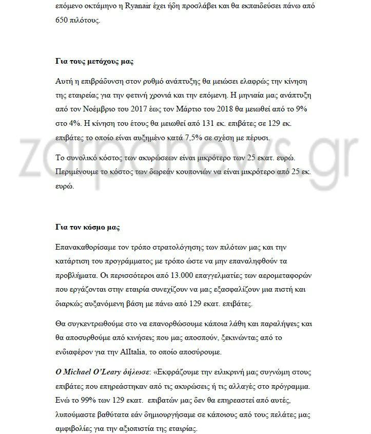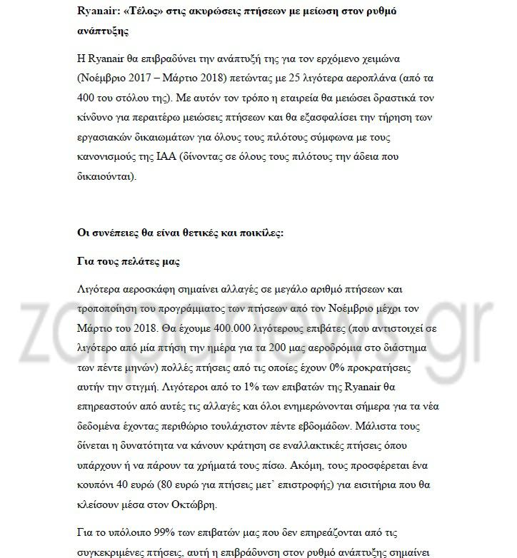Ωστόσο την περασμένη εβδομάδα η αεροπορική εταιρεία είχε υποσχεθεί ότι δεν θα προχωρήσει σε νέες ακυρώσεις. Σήμερα, εξήγησε σε ένα δελτίο τύπου που εξέδωσε ότι οι νέες ματαιώσεις μεταξύ Νοεμβρίου και Μαρτίου του 2018 αφορούν 18.000 πτήσεις, ήτοι σχεδόν μία πτήση την ημέρα σε κάθε αεροδρόμιο για ένα διάστημα 5 μηνών.