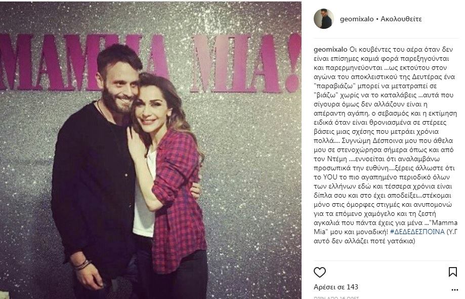 «Οι κουβέντες του αέρα όταν δεν είναι επίσημες καμιά φορά παρεξηγούνται και παρερμηνεύονται …ως εκ τούτου στον αγώνα του αποκλειστικού της Δευτέρας ένα “παραβιάζω” μπορεί να μετατραπεί σε “βιάζω” χωρίς να το καταλάβεις. Αυτά που σίγουρα όμως δεν αλλάζουν είναι η απέραντη αγάπη, ο σεβασμός και η εκτίμηση ειδικά όταν είναι θρονιασμένα σε στέρεες βάσεις μιας σχέσης που μετράει χρόνια πολλά…. Συγνώμη Δέσποινα μου που άθελα μου σε στενοχώρησα σήμερα όπως και από τον Ντέμη», έγραψε στην λεζάντα.