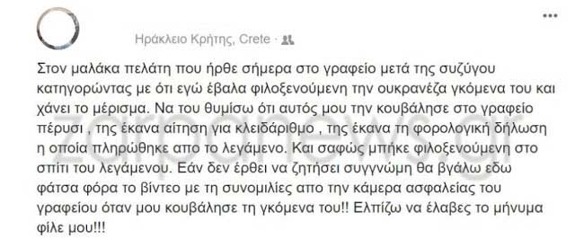 Ο λογιστής με ανάρτησή του στα social media, καλεί τον πελάτη του να ζητήσει συγγνώμη, ενώ προχωρά ακόμα παραπέρα… προειδοποιώντας με δημοσιοποίηση υλικού από κάμερες που δείχνει τον κύριο μετά της ερωμένης να μπαίνουν στο γραφείο του και να “τακτοποιούν” τις υποθέσεις τους.