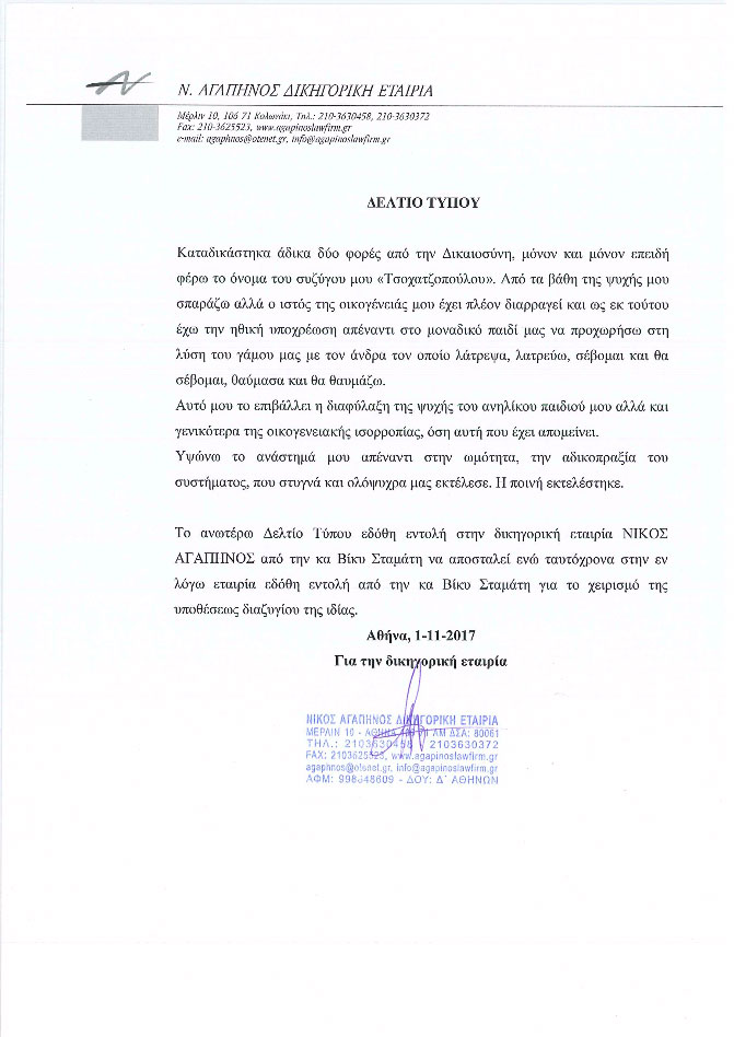 «Καταδικάστηκα άδικα δύο φορές από την Δικαιοσύνη, μόνον και μόνον επειδή φέρω το όνομα του συζύγου μου “Τσοχατζοπούλου”. Από τα βάθη της ψυχής μου σπαράζω αλλά ο ιστός της οικογένειάς μου έχει πλέον διαρραγεί και ως εκ τούτου έχω την ηθική υποχρέωση απέναντι στο μοναδικό παιδί μας να προχωρήσω στη λύση του γάμου μας με τον άνδρα τον οποίο λάτρεψα, λατρεύω, σέβομαι και θα σέβομαι, θαύμασα και θα θαυμάζω.