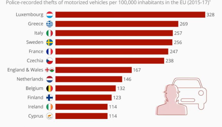 Κατά μέσο όρο, μεταξύ του 2015 και του 2017, το Λουξεμβούργο είχε τον υψηλότερο αριθμό κλοπών αυτοκινήτων στην ΕΕ με 328 κλοπές ανά 100.000 κατοίκους. Στη δεύτερη θέση βρίσκεται η Ελλάδα (269) και στην τρίτη η Ιταλία (257). Από την άλλη, η Δανία έχει το χαμηλότερο ποσοστό κλοπής αυτοκινήτων στην ΕΕ με μόλις 4 κλοπές ανά 100.000 κατοίκους κατά την παραπάνω περίοδο.