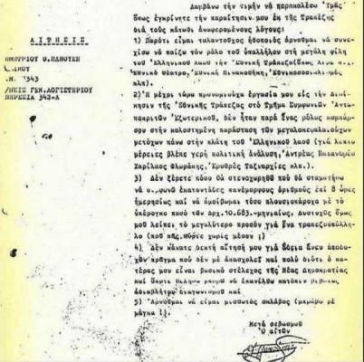 Στον επίλογο της επιστολής, απείλησε ότι θα επιστρέψει στην Τράπεζα, όποτε όμως αυτός θελήσει και «κατόπιν βεβαίως αδιάβλητου διαγωνισμού», καθώς όπως τόνισε ο πατέρας του ήταν «βασικό στέλεχος της Νέας Δημοκρατίας».