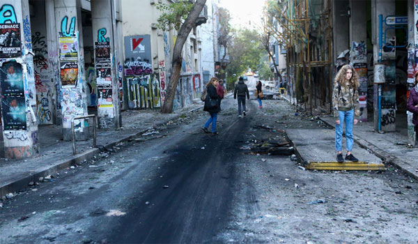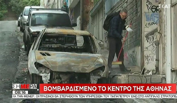 Βομβαρδισμένο τοπίο θυμίζει η εικόνα του κέντρου της Αθήνας, μετά τα εκτεταμένα επεισόδια που έγιναν χθες στους δρόμους γύρω από τα Εξάρχεια στο περιθώριο των συγκεντρώσεων για τα δέκα χρόνια από τη δολοφονία του Αλέξανδρου Γρηγορόπουλου.