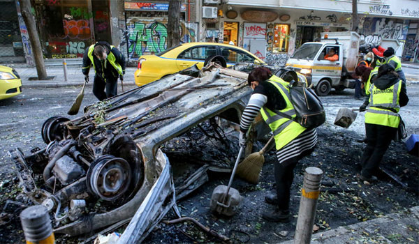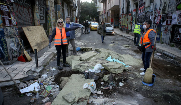 Με το πρώτο φως της ημέρας 65 εργάτες καθαριότητας του δήμου Αθηναίων βγήκαν στους δρόμους για να καθαρίσουν την περιοχή. Μπουλντόζα του δήμου απομακρύνει πεσμένους και καμένους κορμούς δέντρων, ενώ φορτηγά έχουν μεταφέρει έως τώρα 25 τόνους από μπάζα, πέτρες και καμένα αντικείμενα. Οχήματα καθαριότητας πλένουν από το πρωί τους δρόμους, ενώ καμένα αυτοκίνητα και δίκυκλα θα απομακρυνθούν αργότερα, μετά τις απαραίτητες ασφαλιστικές διαδικασίες.